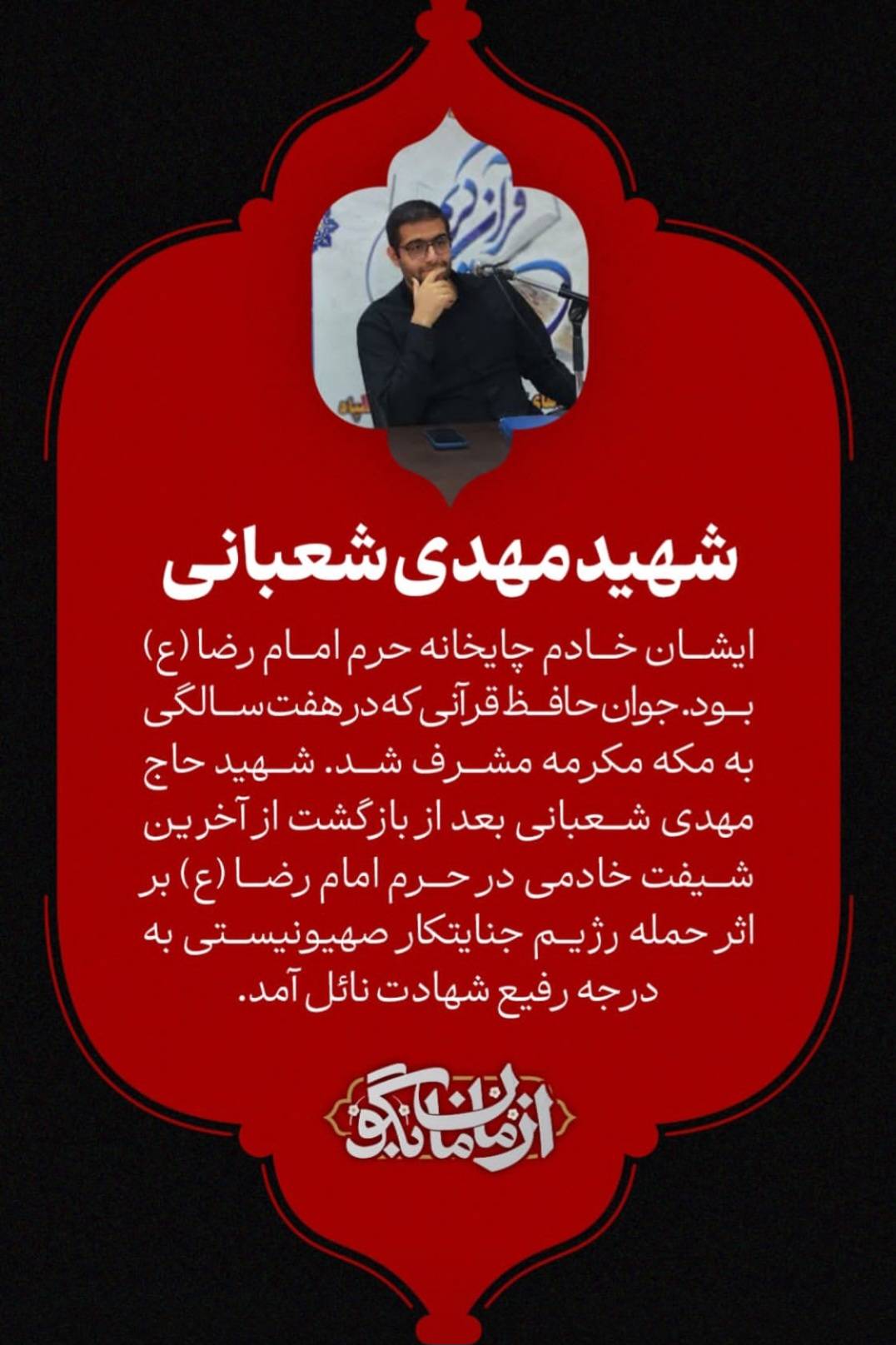 به گزارش پایگاه اطلاعرسانی سیما، در این قسمت از برنامه، خانواده شهید شعبانی با روایتی صمیمی و کمتر شنیدهشده، از ایمان، اخلاق و سبک زندگی فرزندشان سخن خواهند گفت؛ جوانی که حضورش در کنار حرم مطهر، آینهای از عشق به اهلبیت(ع) و پایبندی به اصول انسانی و دینی بود.