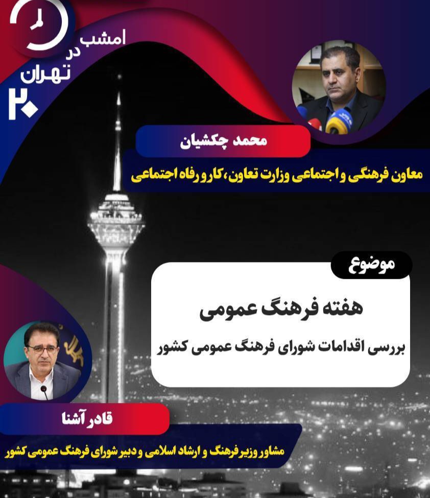 به گزارش پایگاه اطلاعرسانی سیما، «محمد چکشیان»، معاون فرهنگی و اجتماعی وزارت تعاون، کار و رفاه اجتماعی و «قادر آشنا»، مشاور وزیر فرهنگ و ارشاد اسلامی و دبیر شورای فرهنگ عمومی، امشب در برنامه موانع فرهنگی تولید، مؤلفههای فرهنگ کار، چالش اصلی فرهنگ کشور و ... را بررسی خواهند کرد.