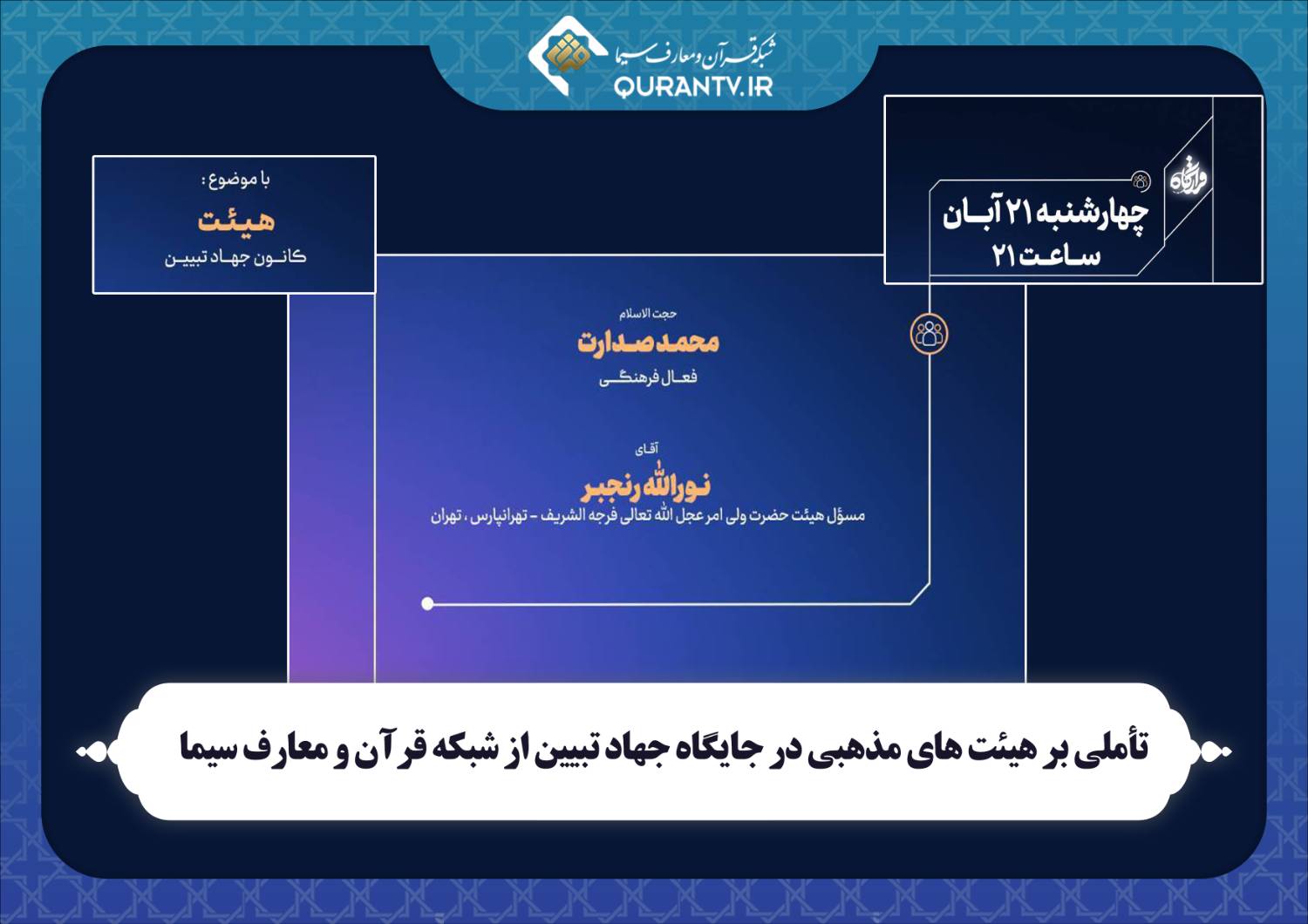 در همین زمینه امشب برنامه «قرارگاه» به موضوع هیئت کانون جهاد تبیین، پرداخته و ضمن دعوت از حجت الاسلام محمد صدارت، فعال فرهنگی و نورالله رنجبر، مسئول هیئت حضرت ولی امر (عج) – تهرانپارس، تهران در خصوص عنوان یاد شده با ایشان گفتگو می شود .