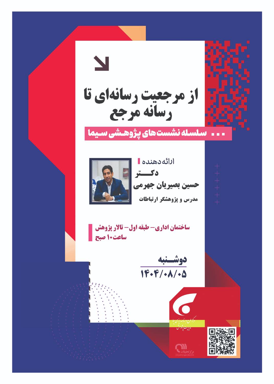 نشست «از مرجعیت رسانهای تا رسانه مرجع» با حضور دکتر حسین بصیریان جهرمی، مدرس و پژوهشگر ارتباطات، دوشنبه ۵ آبان ساعت ۱۰ صبح در تالار پژوهش ساختمان اداری برگزار میشود.