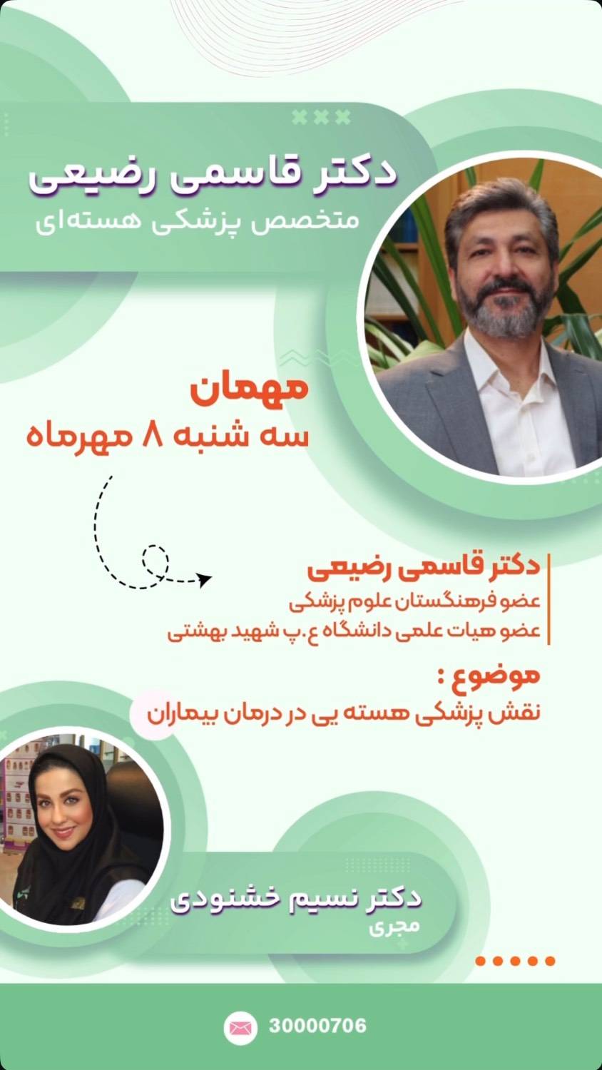 سهشنبه ۸ مهرماه، دکتر قاسمی رضیعی درباره نقش پزشکی هستهای در درمان بیماران با اجرای دکتر نسیم خشنودی در برنامه «دکتر سلام» سخن میگوید.