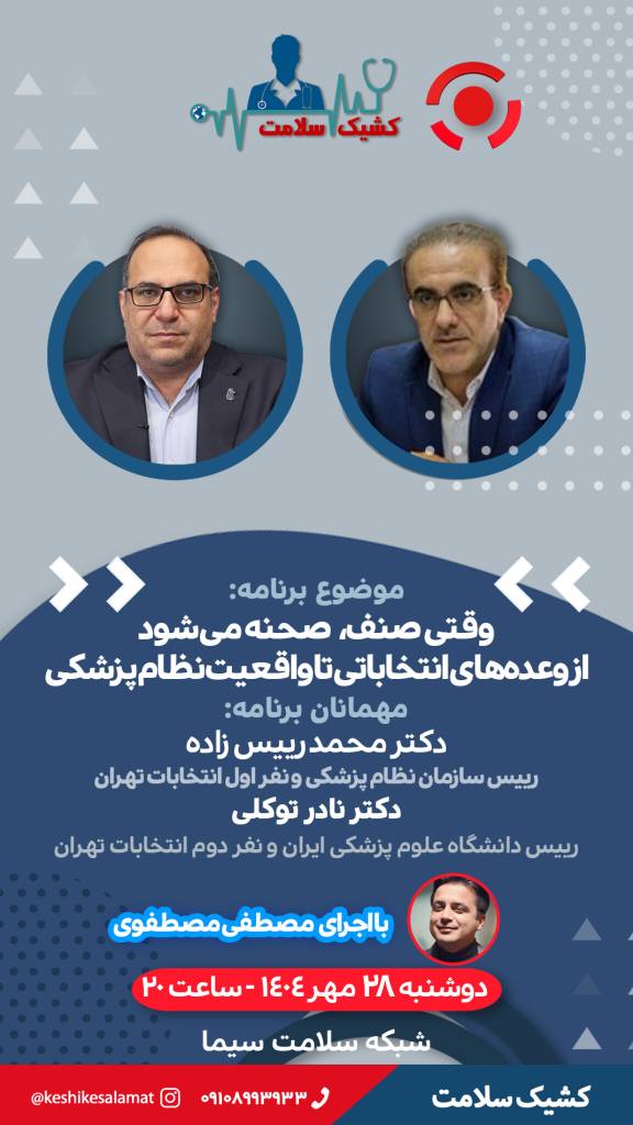 «کشیک سلامت» میزبان نفرات برتر انتخابات نظام پزشکی تهران برنامه زنده «کشیک سلامت» امشب با حضور دکتر محمد رئیسزاده، رئیس کل سازمان نظام پزشکی و نفر اول انتخابات، و دکتر نادر توکلی، رئیس دانشگاه علوم پزشکی ایران و نفر دوم انتخابات نظام پزشکی تهران، از شبکه سلامت سیما پخش میشود. دو شنبه 28 مهر 1404 ادامه...