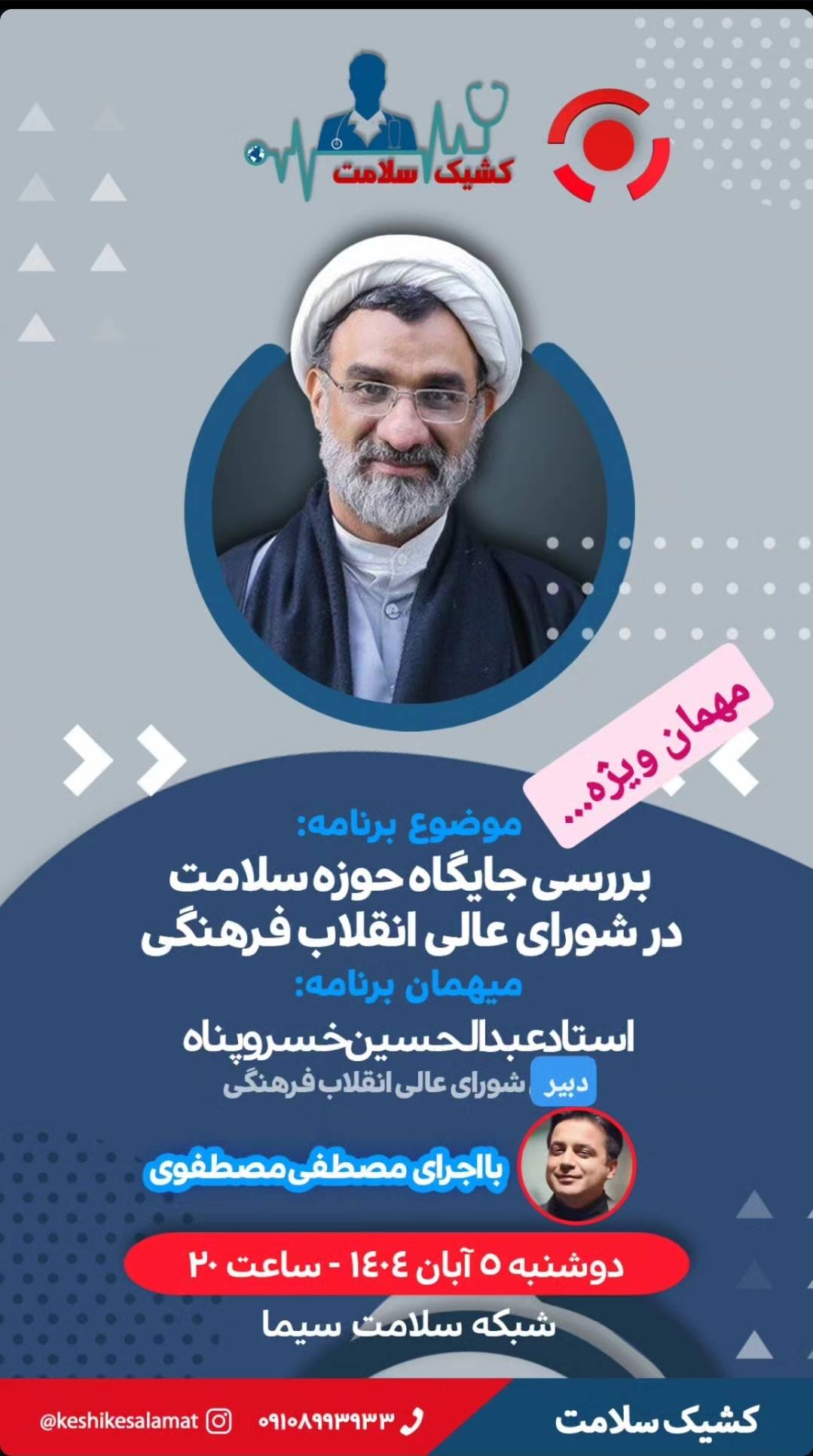 برنامه زنده «کشیک سلامت» با حضور دکتر خسروپناه از شبکه سلامت روی آنتن میرود برنامه زنده «کشیک سلامت» امشب با بررسی جایگاه حوزه سلامت در شورایعالی انقلاب فرهنگی، ساعت ۲۰ از شبکه سلامت سیما پخش میشود. دو شنبه 5 آبان 1404 ادامه...