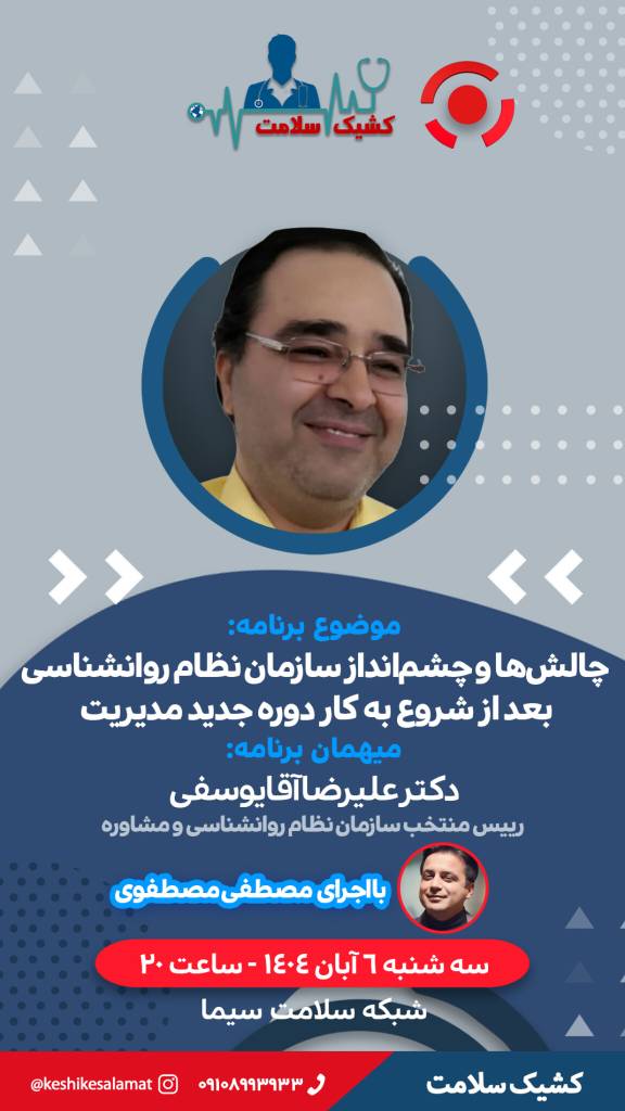 بررسی چالشها و چشمانداز سازمان نظام روانشناسی در دوره جدید مدیریت برنامه زنده «کشیک سلامت» امشب با حضور دکتر علیرضا آقایوسفی، رئیس منتخب سازمان نظام روانشناسی، به بررسی مهمترین چالشها و چشماندازهای پیشروی این سازمان پس از آغاز دوره جدید مدیریت میپردازد. سه شنبه 6 آبان 1404 ادامه...