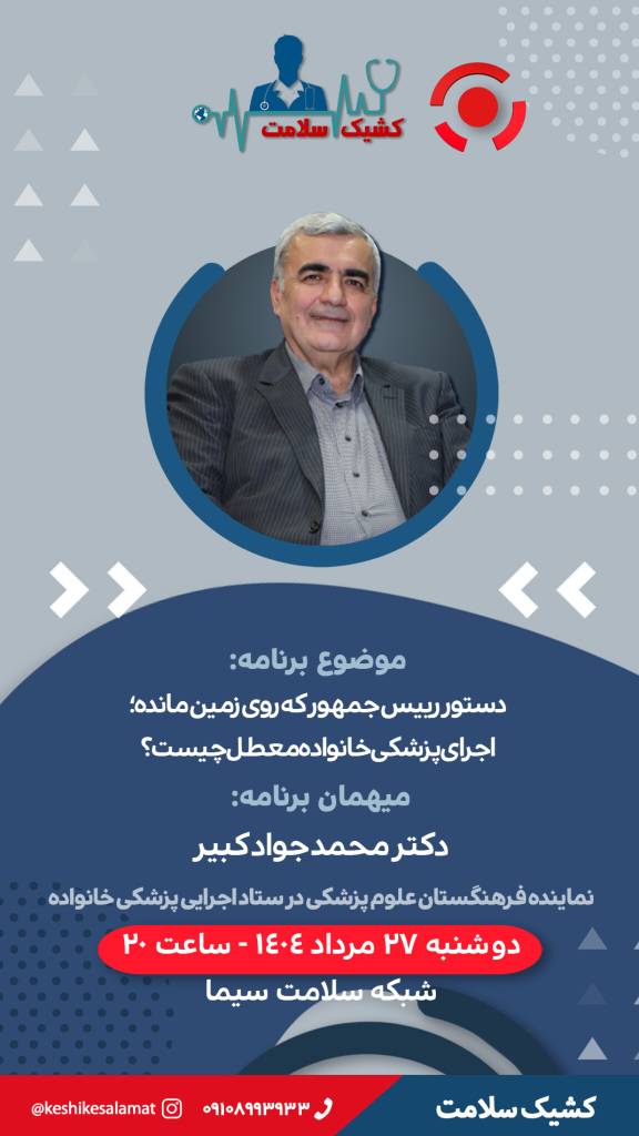 بررسی موانع اجرای طرح «پزشکی خانواده» در برنامه کشیک سلامت برنامه «کشیک سلامت» امشب با موضوع دستور رئیسجمهور درخصوص اجرای طرح «پزشکی خانواده» و دلایل تعلل در اجرای آن از شبکه سلامت سیما پخش میشود. دو شنبه 27 مرداد 1404 ادامه...