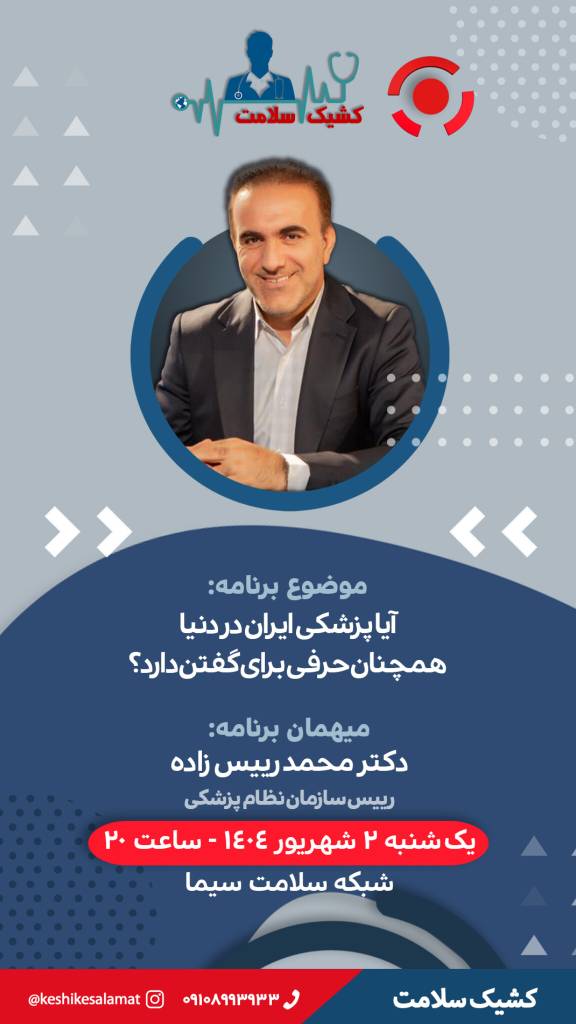 «کشیک سلامت» با موضوع جایگاه پزشکی ایران در جهان برنامه زنده «کشیک سلامت» امشب با حضور دکتر محمد رئیسزاده، رئیس کل سازمان نظام پزشکی کشور، از شبکه سلامت سیما پخش میشود. یک شنبه 2 شهریور 1404 ادامه...