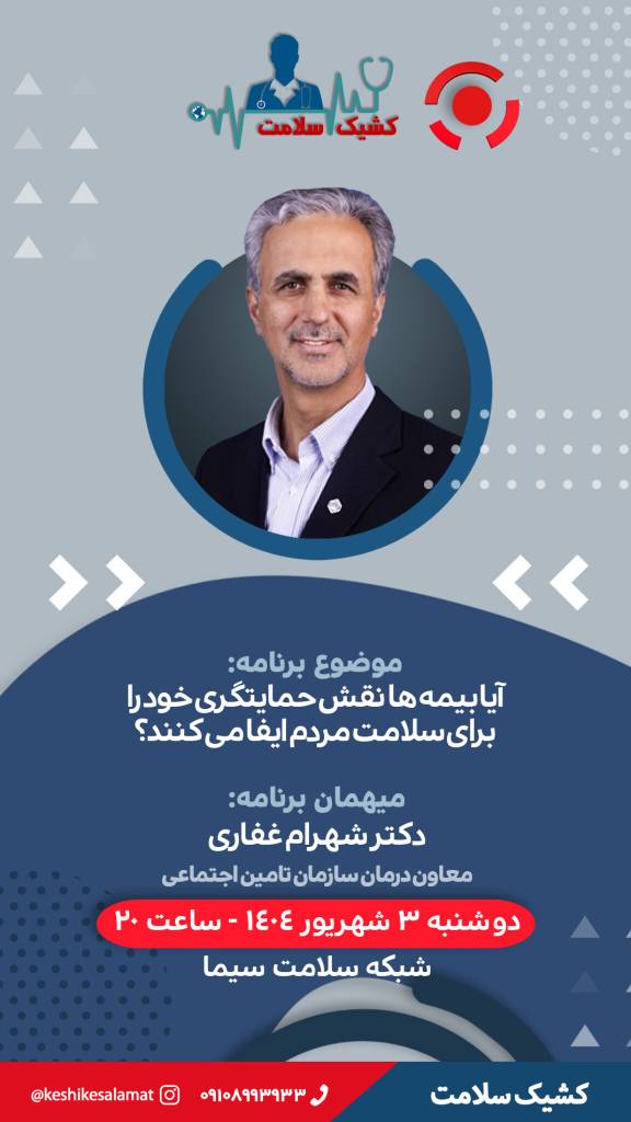«کشیک سلامت» با موضوع نقش بیمهها در حمایت از سلامت مردم برنامه زنده «کشیک سلامت» امشب با حضور دکتر شهرام غفاری، معاون درمان سازمان تامین اجتماعی، به بررسی نقش بیمهها در حمایت از سلامت مردم میپردازد. دو شنبه 3 شهریور 1404 ادامه...