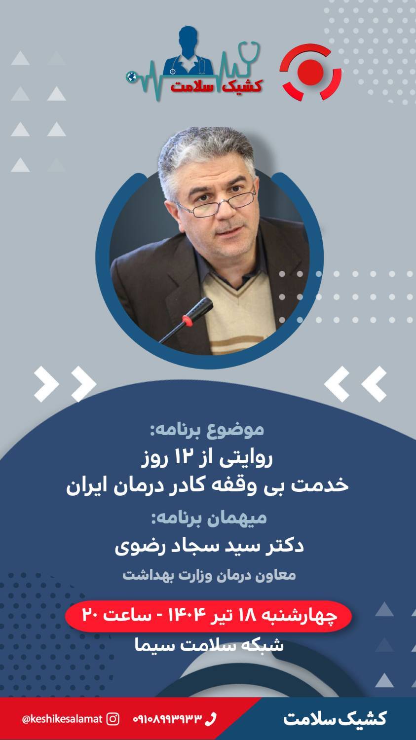 «کشیک سلامت» امشب با حضور معاون درمان وزارت بهداشت روی آنتن میرود برنامه زنده «کشیک سلامت» امشب با حضور دکتر سید سجاد رضوی، معاون درمان وزارت بهداشت، از شبکه سلامت سیما پخش میشود. چهار شنبه 18 تیر 1404 ادامه...