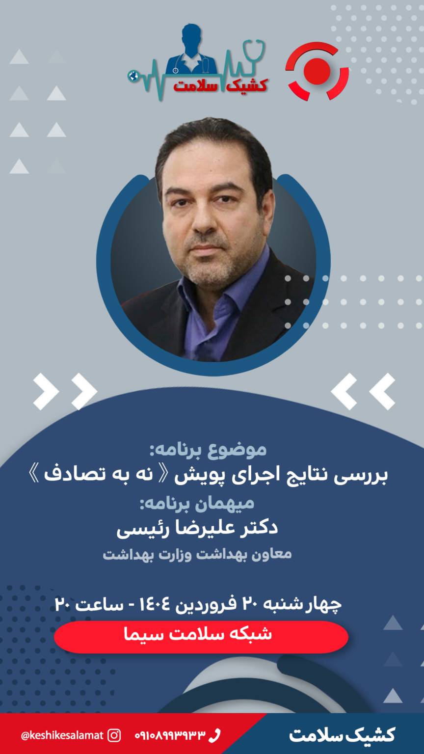 بررسی نتایج پویش "نه به تصادف" در «کشیک سلامت» برنامه زنده «کشیک سلامت» با موضوع بررسی نتایج پویش "نه به تصادف" روی آنتن شبکه سلامت می رود. چهار شنبه 20 فروردین 1404 ادامه...