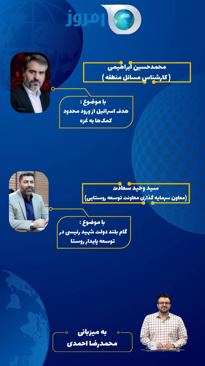 بررسی توسعه پایدار روستا در دولت شهید رئیسی در برنامه «امروز» «امروز» به تهیه کنندگی علیرضا متقیان، امروز ساعت ۱۸:۰۰ روی آنتن شبکه یک خواهد رفت. سه شنبه 30 اردیبهشت 1404 ادامه...