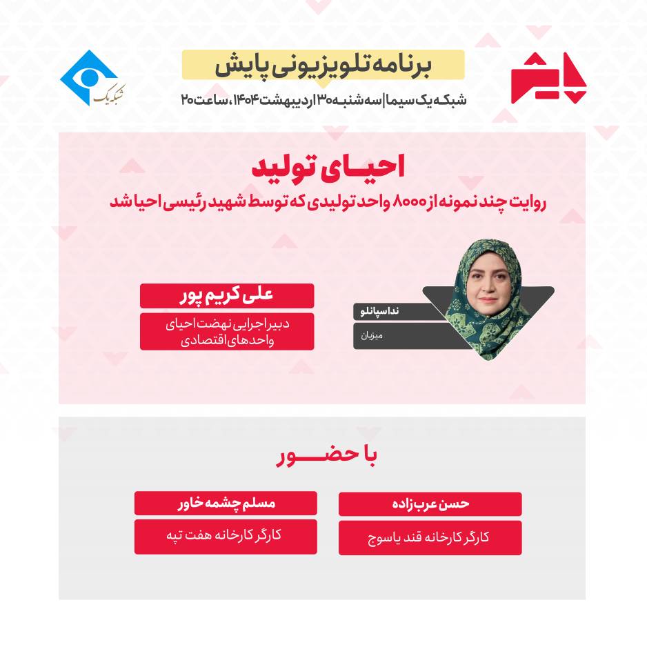 مروری بر «احیای تولید» در دولت رئیس جمهور شهید در برنامه «پایش» برنامه «پایش» به تهیه کنندگی ایمان علیمحمدی امشب 30 اردیبهشت ساعت 20 به روایت چند نمونه از 8 هزار تولیدی احیا شده توسط شهید رئیسی از قاب شبکه یک خواهد پرداخت. سه شنبه 30 اردیبهشت 1404 ادامه...