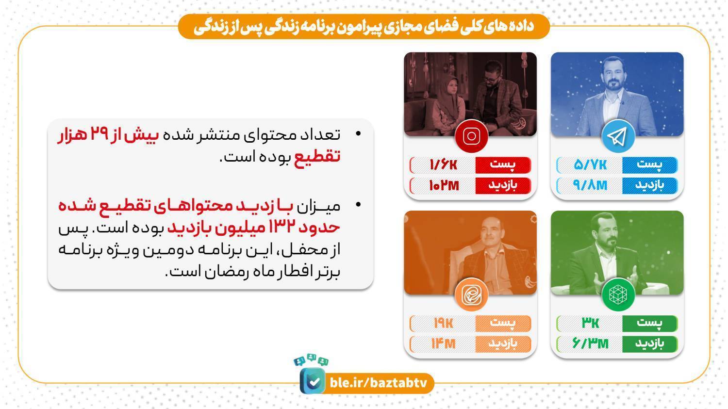 ۱۳۲ میلیون بازدید برای برنامه تلویزیونی «زندگی پس از زندگی» براساس گزارش اتاق وضعیت معاونت فضای مجازی، میزان بازدید محتواهای تقطیع شده برنامه «زندگی پس از زندگی» حدود ۱۳۲ میلیون بازدید بوده است. شنبه 23 فروردین 1404 ادامه...