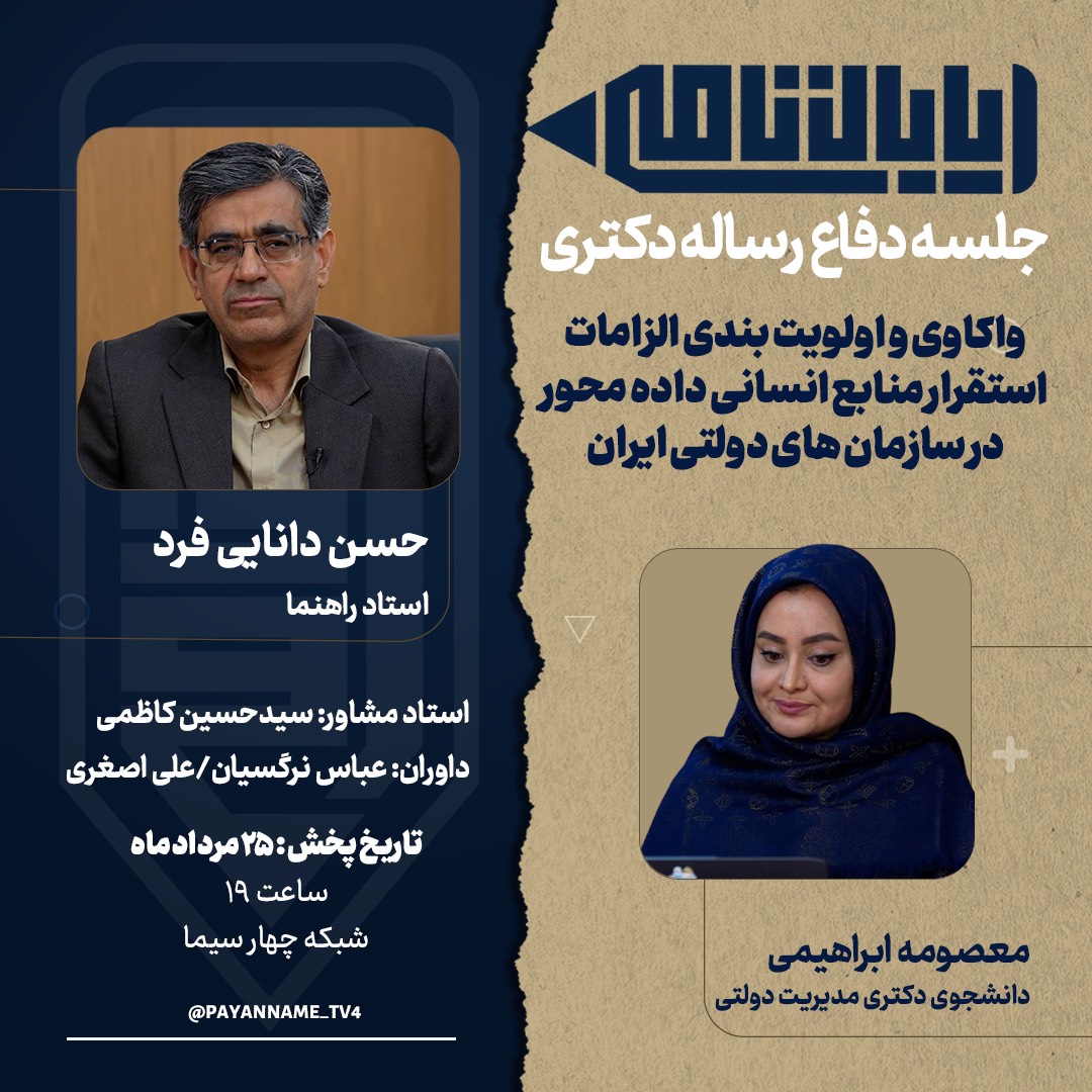 دفاع رساله دکتری درباره «واکاوی و اولویتبندی الزامات استقرار منابع انسانی دادهمحور در سازمانهای دولتی ایران در برنامه «پایاننامه» جلسه دفاع رساله دکتری معصومه ابراهیمی با موضوع «واکاوی و اولویتبندی الزامات استقرار منابع انسانی دادهمحور در سازمانهای دولتی ایران» در قالب برنامه «پایاننامه» از شبکه چهار سیما پخش میشود. شنبه 25 مرداد 1404 ادامه...