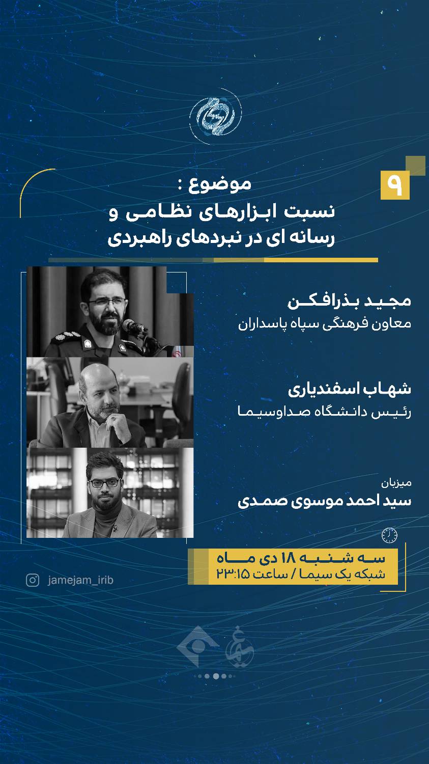 ورود «جامجم» به ماجرای نسبت ابزارهای نظامی و رسانهای در نبردهای راهبردی امشب «جامجم» موضوع نسبت ابزارهای نظامی و رسانهای در نبردهای راهبردی بنابر تأکید رهبر انقلاب در پیامشان به نشست افق تحول رسانه ملّی داشتند را در دستور کار خود قرار داده است. سه شنبه 18 دی 1403 ادامه...