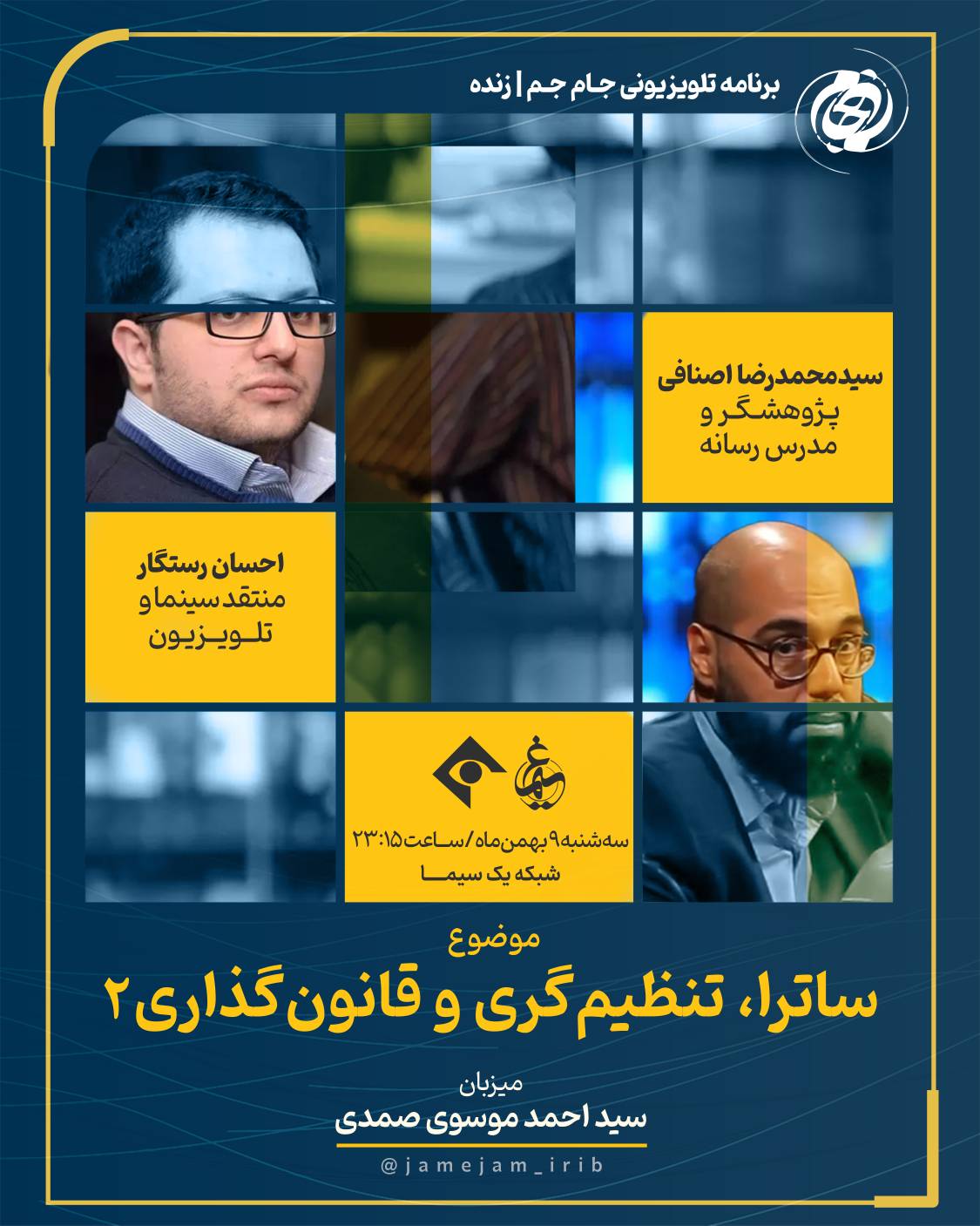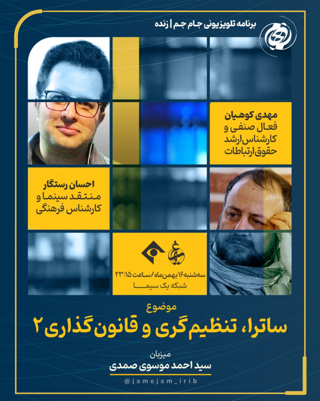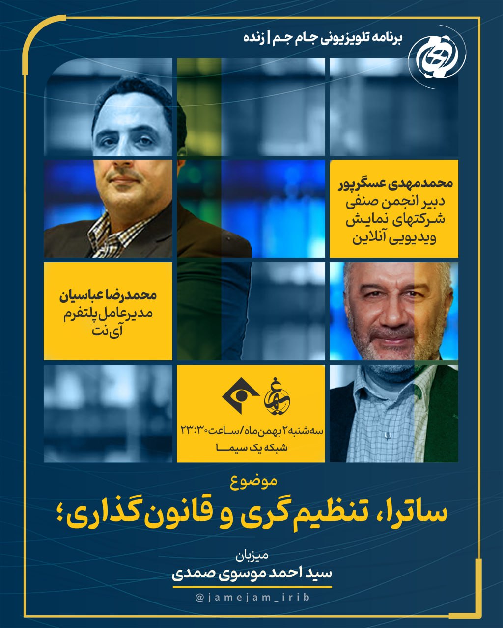 مناظره «جامجم» درباره ساترا ادامه دارد برنامه تلویزیونی «جامجم» به دنبال پرونده «ساترا، تنظیمگری و قانونگذاری» با حضور یک منتقد و یک فعال صنفی و حقوقدان درباره نمایشخانگی و نظارت بر آن بحث میشود. سه شنبه 16 بهمن 1403 ادامه...