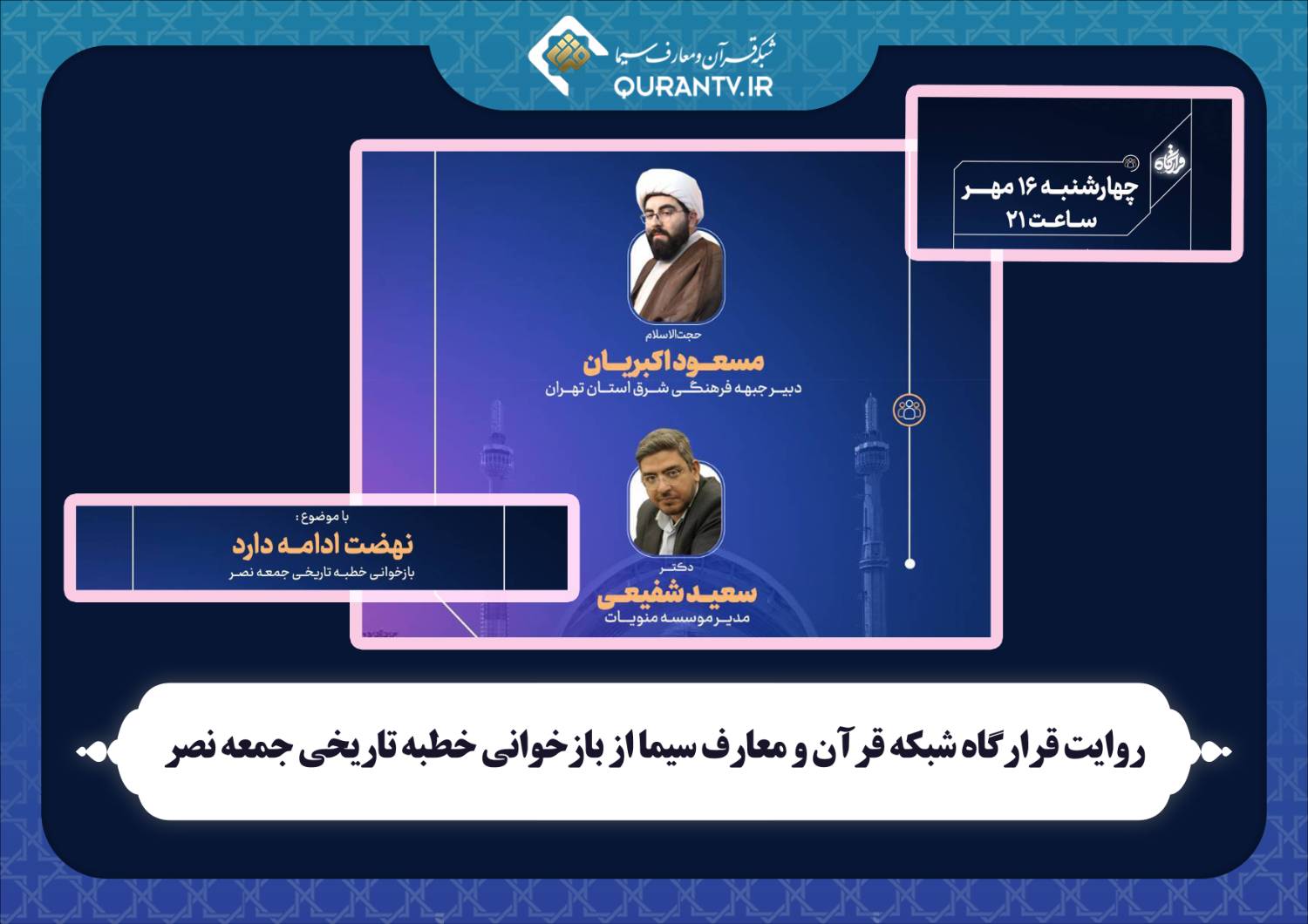 روایت «قرارگاه» شبکه قرآن و معارف سیما از بازخوانی خطبه تاریخی جمعه نصر برنامه «قرارگاه» امشب با موضوع نهضت ادامه دارد، از شبکه قرآن و معارف سیما پخش می شود. چهار شنبه 16 مهر 1404 ادامه...