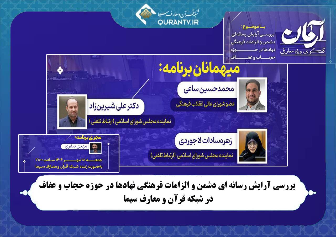 بررسی آرایش رسانه ای دشمن و الزامات فرهنگی نهادها در حوزه حجاب در شبکه قرآن و معارف برنامه «آرمان»، جمعه 18 مهر ماه با موضوع، بررسی آرایش رسانه ای دشمن و الزامات فرهنگی نهادها در حوزه حجاب و عفاف از شبکه قرآن و معارف سیما پخش می شود. جمعه 18 مهر 1404 ادامه...