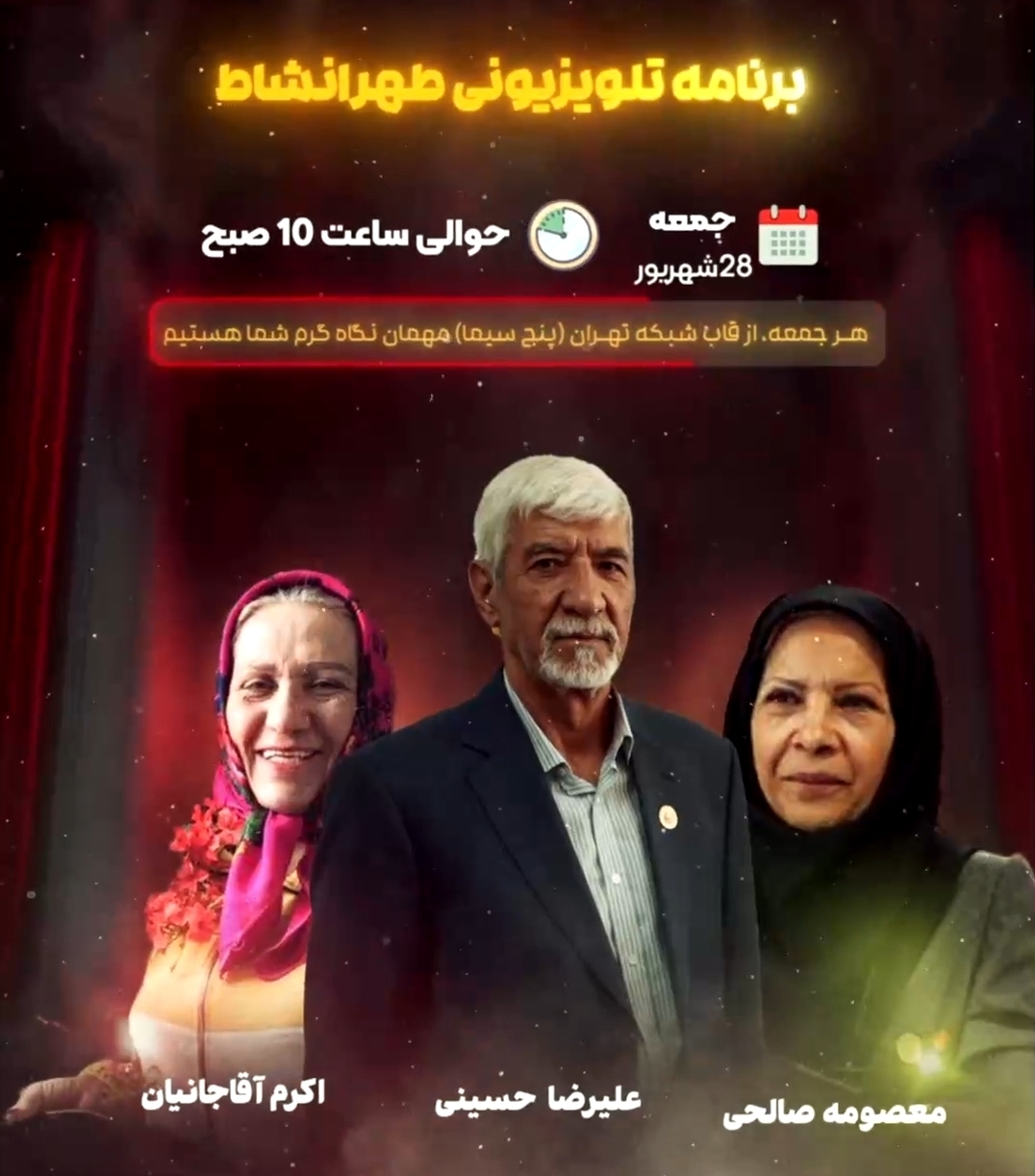 بررسی مسائل دوران سالمندی در برنامه «طهرانشاط» برنامه زنده و شاد «طهرانشاط» جمعه ۲۸ شهریور، ساعت ۱۰:۳۰ از قاب شبکه تهران تقدیم نگاه پر مهر مخاطبان می شود. پنج شنبه 27 شهریور 1404 ادامه...