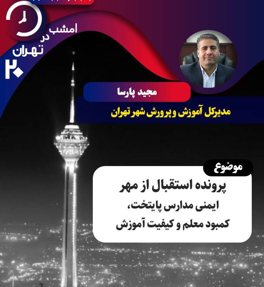 بررسی کمبود معلم و ایمنی مدارس در «تهران ۲۰» ایمنی مدارس پایتخت، کمبود معلم و کیفیت آموزش و نوسازی مدارس موضوع گفتگو امشب برنامه «تهران ۲۰» است که از قاب شبکه تهران تقدیم نگاه مخاطبان میشود. شنبه 29 شهریور 1404 ادامه...
