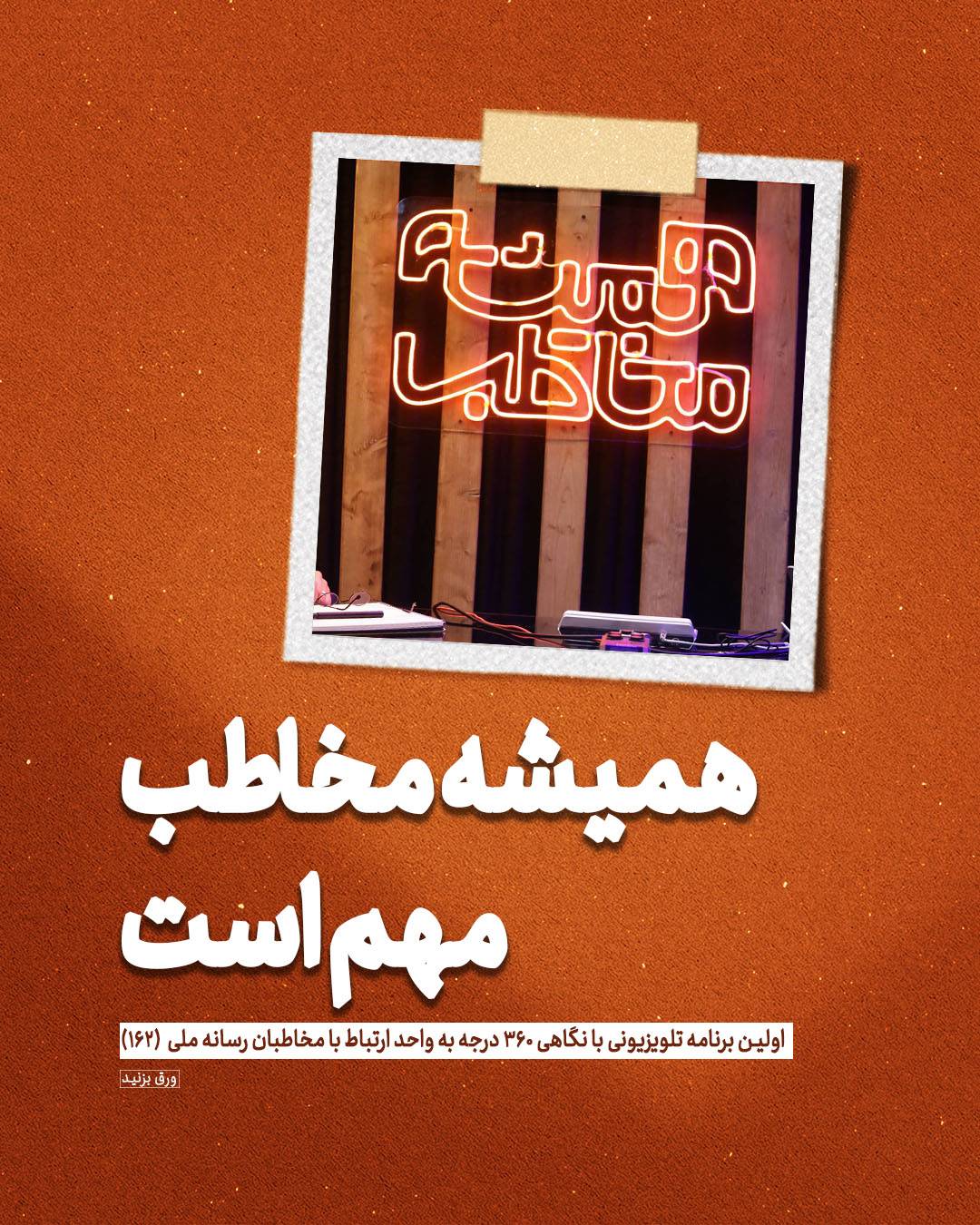 نخستین برنامه تلویزیونی با نگاهی ۳۶۰ درجه به تماس های مردمی در ۱۶۲ «همیشه مخاطب» عنوان برنامه ای است که شنبه ها حوالی ساعت ۱۵:۳۰ از شبکه تهران پخش می شود شنبه 23 فروردین 1404 ادامه...