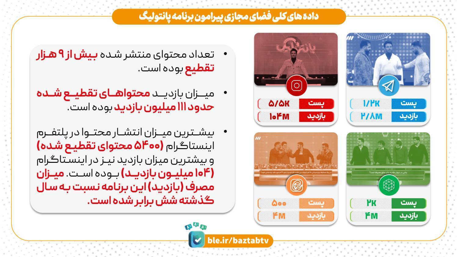۱۱۱ میلیون بازدید مجازی برای برنامه «پانتولیگ» داده کاوی برنامه تلویزیونی «پانتولیگ» در ماه رمضان و عید نوروز نشان می دهد که این برنامه ۱۱۱ میلیون بازدید مجازی داشته است. شنبه 13 اردیبهشت 1404 ادامه...